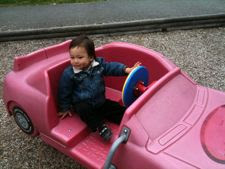 Tristan may not always look like a boy but he plays like one. Okay to be fair, girls can act like this too. Tristan loves to play with cars and trains. He signs train, car, bus, airplane, and bike. He can say bus but only signs and makes motor noises with the rest. Well, he calls a bike "dooy." Not sure why but he just does :) I know Tristan played with dolls a bit at daycare, which I thought was cool but he definitely has a preference for vehicles and things that involve interaction and music.